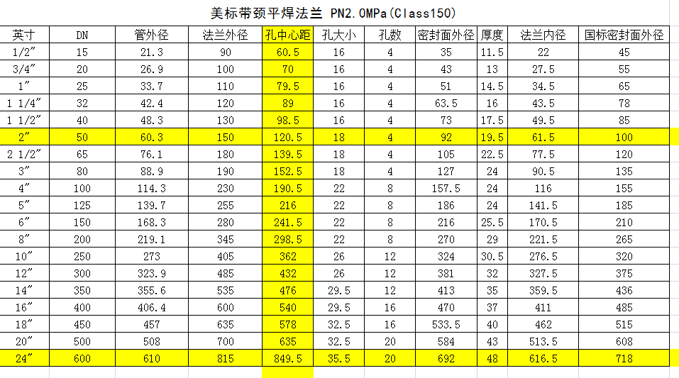 美標法蘭通常是指作為美國 國 家標準的ASME B16.5、B16.36、b16.47、B16.48所描述的法蘭標準。美標法蘭的壓力等級適用再PN2.5~PN4.0。材質(zhì)可為碳鋼、304、316、316L等。美標法蘭尺寸標準和我們國標或者行標法蘭不同。那么,美標帶頸平焊法蘭的尺寸是怎樣的呢?下面我們來了解一下: